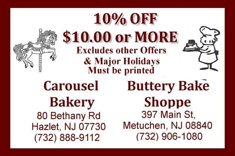 Introducing Carousel Bakery, a bakery located at 80 Bethany Rd Hazlet, NJ 07730. This bakery offers a variety of gluten-free options and provides services such as takeout, delivery, catering, and accepts credit cards, Android Pay, and Apple Pay. With bike parking available, Carousel Bakery makes it convenient for customers to indulge in their delicious baked goods. The menu at Carousel Bakery is filled with a wide selection of pastries, bread, cakes, and more. From their freshly baked bread to decadent desserts, every item is made with quality ingredients and skillful craftsmanship. Don't miss out on the chance to experience the mouthwatering treats at Carousel Bakery and satisfy your sweet cravings.